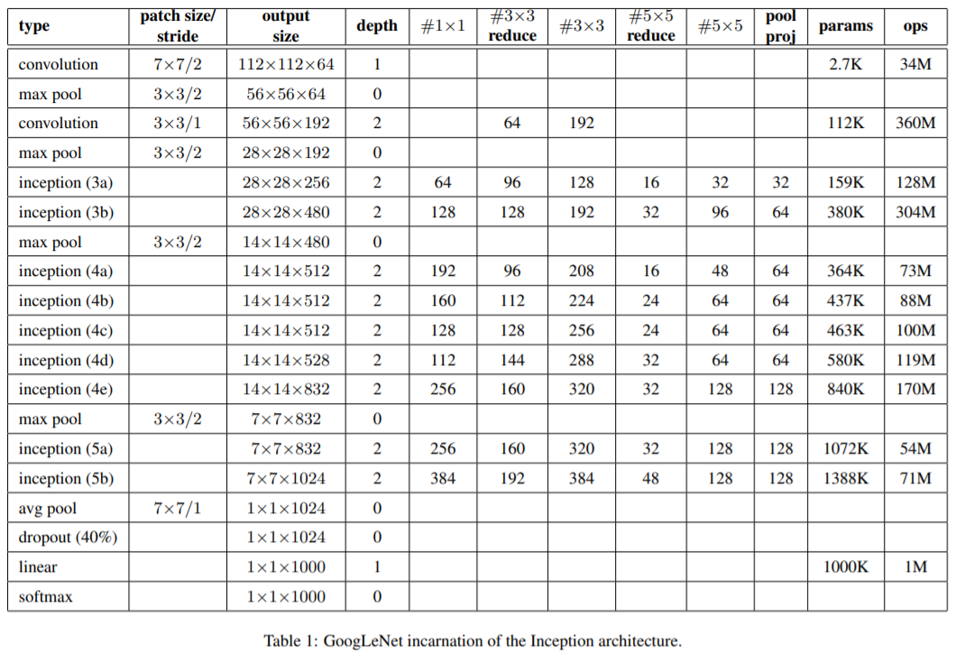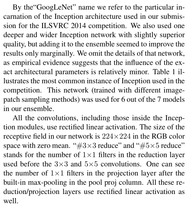 Inception modules 내부를 포함한 모든 convolutions은 rectified linear activation를 사용한다. receptive field의 크기는 the RGB color space with zero mean에서 224×224이다. “#3×3 reduce” 와 “#5×5 reduce” 는 3×3 and 5×5 convolutions 이전에 사용된 reduction layer 1×1 filters를 볼 수 있다. pool proj column에 내장된 max-pooling후 projection layer 에서 1×1 filters를 볼 수 있다. 이 모든 reduction/projection layers은 rectified linear activation도 사용한다.