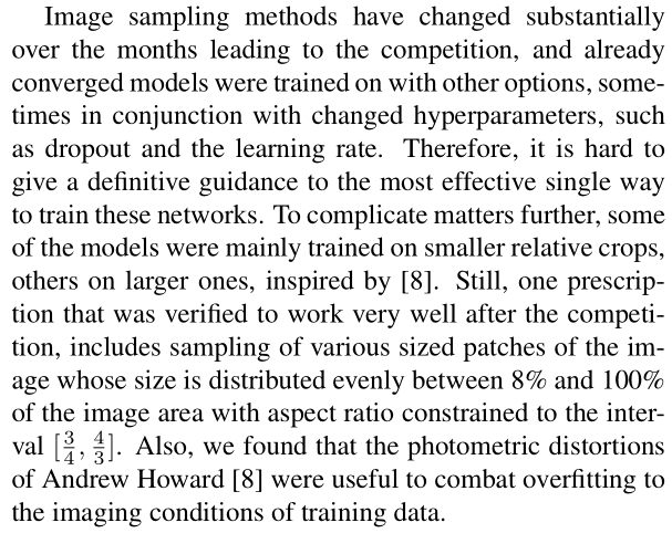 Image sampling방법은 competition의 몇달 동안 크게 변화하였으며, 이미 converged models은 다른 옵션과 함께 학습되었으며, 때로는 dropout 및 learning rate과 같은 hyperparameters를 변화했기도 했다. 따라서 이러한 네트워크를 학습시키는 가장 효과적인 단일 방법에 대한 명확한 지침을 제공하는 것은 어렵다. 상황을 더 복잡하게 만든다면, 일부 모델은 주로 [8]에서 영감을 받아 작은 crop에 대해 주로 학습하였고 , 다른 모델은 더 큰 crop에 대해 학습되었다. 그러나 competition후 매우 잘 작동하는 것으로 확인된 한 가지 처방에는 가로 세로 비율이 간격에 제한된 이미지 영역의 8%와 100% 사이에 크기가 고르게 분포된 이미지의 다양한 크기의 패치 샘플링이 포함된다 [ 3/4,4/3]. ([ 3/4,4/3] 로 제한하여 8%와 100% 크기에서 균등 분포로 patch sampling 하는 것이 매우 잘 동작한다. 다양한 patch의 크기를 사용한다. ) 또한 Andrew Howard[8]의 photometric distortions 이 훈련 데이터의 imaging 조건에 overfitting 하는데 유용하는 것을 발견되였다.