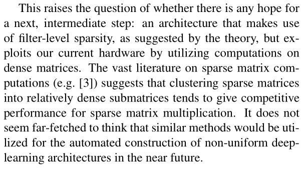 이는 다음 중간 단계, 즉 이론에서 제안한 대로 filter-level sparsity을 사용하지만 밀도가 높은 행렬에 대한 연산을 활용하여 현재 하드웨어를 활용하는 아키텍처에 대한 희망이 있는지에 대한 의문을 제기한다. => filter-level sparsity dense matricessparse matrix computations (e.g. [3])에 대한 방대한 논문은 sparse matrices을 상대적으로 상대적으로 밀도가 높은 하위 행렬로 클러스터링하는 것이 sparse matrix multiplication에 대한 경쟁적 성능을 제공하는 경향이 있음을 시사한다. (하위 행렬로 ) 가까운 미래에 대한 non-uniform deep-learning architectures의 자동 구축을 위해 유사한 방법이 활용될 것이라고 생각하는 것은 믿기지 않은 일이 아닌 것 같다.