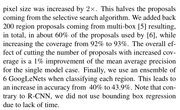 마지막으로 object detection을 위한 state of the art기술은 Girshick et al.[6] Regions with Convolutional Neural Networks (R-CNN) 방법이다. R-CNN은 전제적인 detection problem두가지 하위 문제로 분해한다. category-agnostic 적인 방식으로 object location proposals을 생성하기 위해 color and texture 와 같은 low-level cues 를 활용하고 CNN classifiers를 사용하여 해당 위치에서 객체 범주를 식별한다. 이러한 2단계 접근방식은 state-of-the-art CNNs의 매우 강력한 classification 뿐만아니라 bounding box segmentation 의 정확성을 활용한다.우리는 detection submissions시 similar pipeline을 채택했지만 higher object bounding box recall을 위한 multi-box [5] prediction및 bounding box proposals의 더 나은 분류를 위한 ensemble approaches 같은 두 단계의 개선사항을 탐구했다.