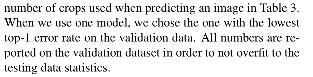 또한 Table 3 에서 이미지를 예측할 때 사용되는 모델 수 와 crops수를 변경하여 여러 테스트 선택의 성능을 분석하고 보고한다. 하나의 모델을 선택할 때, 우리는 validation data에서 가 top-1 error rate 가 잴 낮은 것을 선택했다. 모든 숫자는 testing data statistics에 overfit 되지 않도록 validation dataset에 대해 보고했다.