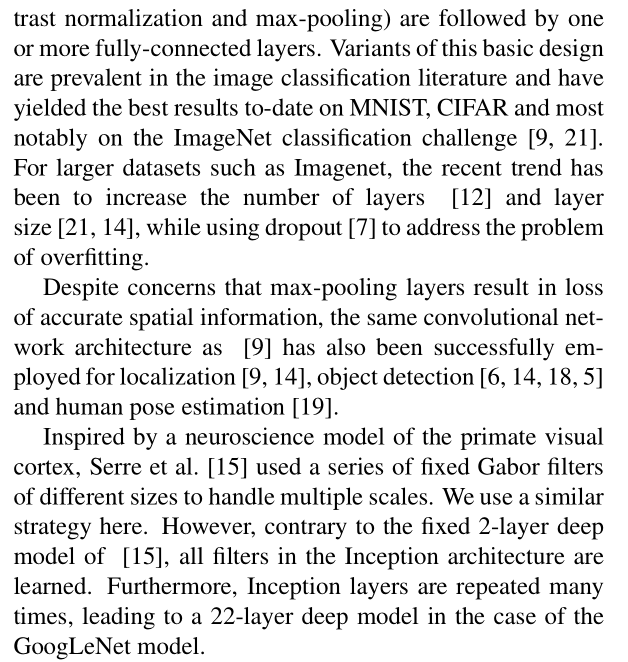 primate visual cortex의 신경과학 모델에서 영감을 받은 Serre et al. [15] multiple scales를 처리하기 위해 크기가 다른 일련의 고정 Gabor filters 를 사용하였다. 우리는 여기서 비슷한 전략을 사용한다. 그러나 [15]의 고정된 2-layer deep mode과 반대로 , Inception architecture 의 필터는 모두 학습된다. 또한 Inception layers은 여러 번 반복되어 GoogLeNet 모델의 경우 22-layer deep model로 이어진다.