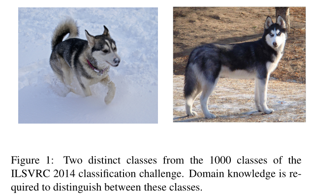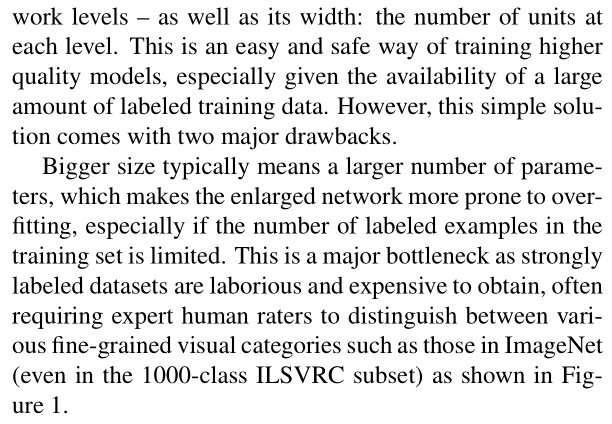 1). size가 클 수록 parameters의 수가 많아져 확장된 network가 over-fitting되기 쉬우며, 특히 학습 세트에서 라벨링된 예제의 수가 제한적일 경우 더욱 그러하다. 이는 라벨이 강한 데이터 세트를 얻기 어렵고 비용이 많이 들기 때문에 그림 1에서와 같 ImageNet(1000 클래스 ILSVRC 하위 집합에서도)과 같은 다양한 세분화된 시각적 범주를 전문 인간 평가자가 구별해야 하는 주요 병목 현상이다. => verfitting이 되기 쉽기 때문에 세분화한 라벨이 많이 필요하다.