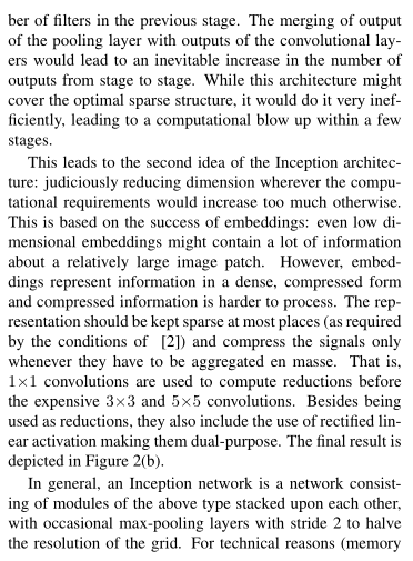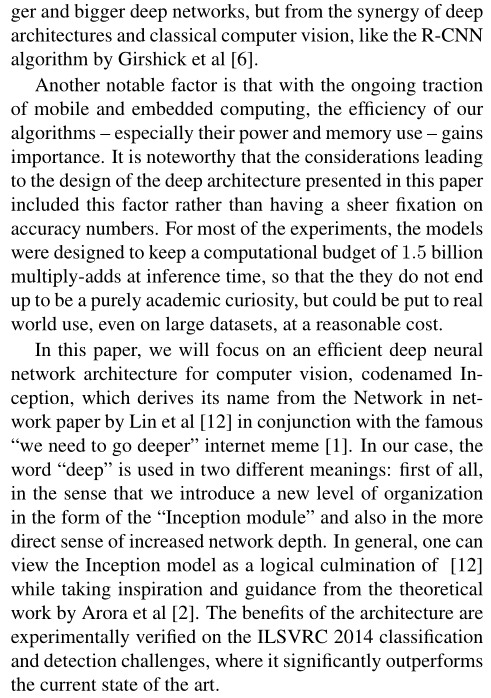 또 다른 주목할 만한 요인은 모바일 및 embedded computing의 지속적인 견인으로 알고리즘의 효율성, 특히 성능과 메모리 사용이 증가한다는 것이다. 이 논문에서 제시된 deep architecture 설계로 이어지는 고려사항에는 정확도 수치에 대한 집착보다는 이 요소가 포함되었다는 점이 주목할 만하다. 대부분의 실험에서 추론 시간에 에서 multiply-adds들의 1.5 billion 계산 비용을 유지하도록 설계되었으며, 따라서 모델은 순수한 academic curiosity으로 끝나지 않고 심지어 대규모 데이터셋에서도 합리적인 비용으로 실제 사용할 수 있다.본 논문에서 우리는 컴퓨터 비전을 위한 효율적인 심층 신경망 아키텍처에 초점을 맞출 것이다. 이 architecture의 이름은 Lin et al [12]에서 작성한 Network in network paper이름에서 유래한 것으로 유명한 "“we need to go deeper”" 로 internet meme [1] 과 관련있다. 이름은 Incetpion 이다. => Network in network