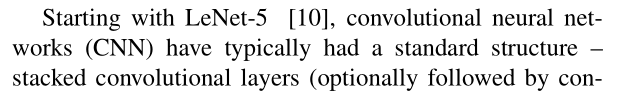 LeNet-5 를 시작으로, convolutional neural networks (CNN) 은 일반적으로 표준구조를 가지고 있다. 즉, stacked convolutional layers ( 선택적으로 대비 normalization and max-pooling)에 하나 이상의 fully-connected layers가 따라오는 구조 이다. 이러한 기본 구로를 변형한 모델들은 이미지 분류분야에 널리 사용되며, to-data MNIST, CIFAR 및 ImageNet classfication challenge[9, 21] 에서 최고의 성과를 얻었다. ImageNet 과 같은 대용량 데이터에서 최근 trend는 drouput[7] 로 overfitting문제를 해결하면서 레이어 수[12] 와 레이어 사이즈[21,14]를 늘이는 것이다.