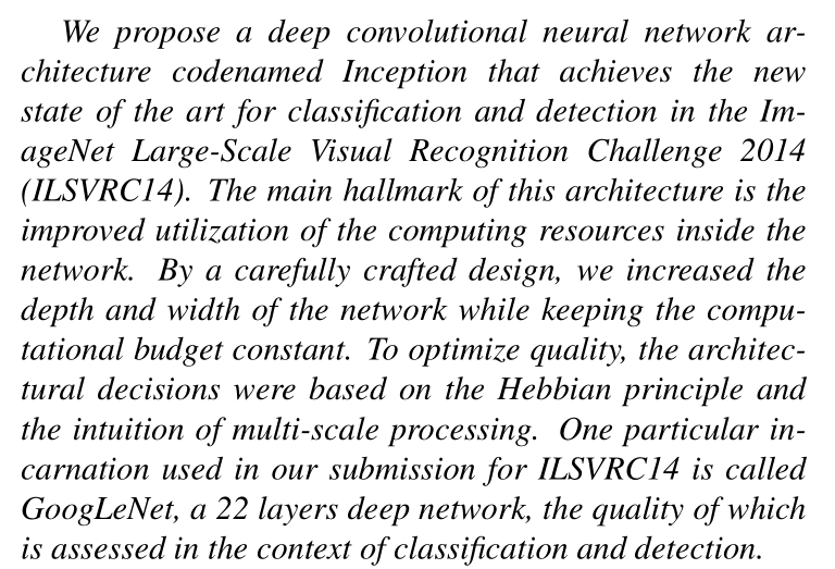 우리는 ImageNet Large-Scale Visual Recognition Challenge 2014 (ILSVRC14)에서 classification and detection 새로운 state of the art 달성하는 deep convolutional neural network architecture codenamed Inception 을 제안했다. 이 architecture 의 주요 특징은 network 내부의 computing resources의 활용도 향상이다. 세심하게 crafted design에 의해 , 계산 비용을 유지하면서, network 의 depth and width 을 놀렸다. 품질을 최적화하기 위해, architectural decisions 은 Hebbian 와 multi-scale processing의 직관성에 기반으로 했다. ILSVRC14 에 대한 제출에 사용된 모델은 GoogLeNet으로, 22 layers deep network이며 그 품질은 classification and detection의 context에서 평가된다.