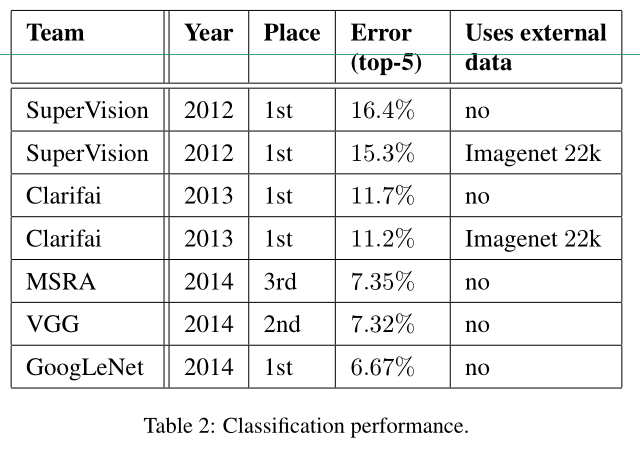 우리의 final submission to the challenges는 검증 및 테스트 데이터 모두에서 상위 5개 오류를 6.67% 얻어 다른 참가자 중 1위를 차지했다. 이는 2012년 SuperVision 접근법에 비해 56.5%의 상대적 감소이며, 두 가지 모두 분류기 교육에 외부 데이터를 사용한 전년도 최우수 접근법(Clarifai)에 비해 약 40%의 상대적 감소이다.Table 2 는 지난 3년간 가장 실적이 좋은 접근법의 통계를