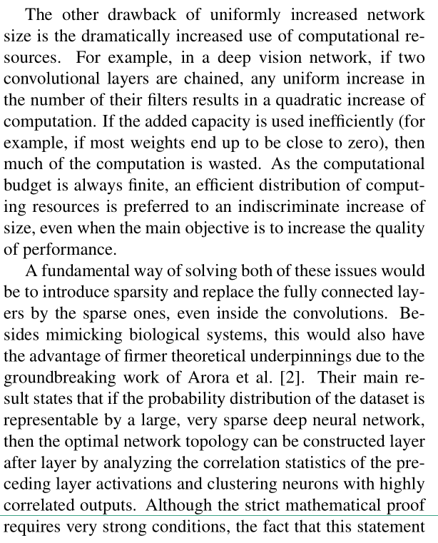 2). 또 다른 단점은 네트워크의 크기를 늘리는 것은 컴퓨터 자원의 사용이 크게 증가한다.컴퓨터 계산 능력이 크게 요구된다. 예를 들어 , deep vision network에서 두개의 convolutional layers가 체인된 경우, filters 수가 증가하면 계산이 quadratic(예: x^2) 증가하게 된다. 추가된 용량이 비효율적으로 사용될 경우(예: 대부분의 가중치가 0에 가까운 경우) 계산의 많은 부분이 낭비된다. 계산 비용은 항상 한정되기 때문에, 주요 목적이 성능 품질을 높이는 것일지라도 크기를 무분별하게 증가시키는 것보다 컴퓨팅 자원의 효율적인 분배가 선호된다. (컴튜어 자원은 한정하기 때문에 , 네트워크의 사이즈를 늘리는 것 보다 컴퓨팅 자원을 효율적으로 분배하는 것이 더 중요하다.)
