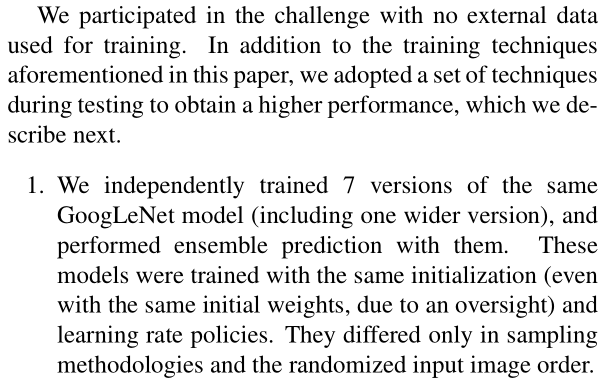 1. 앙상블 - 동일한 GoogLeNet 모델 7개 버전(더 넓은 버전 1개 포함)을 독립적으로 교육하고 앙상블 예측을 수행했다. 각 모델들은 동일한 widht initialization (감독으로 인해 동일한 초기 가중치를 사용하더라도) 과 learning rate policies학습하였다. 그들은 sampling methodologies와 randomized input image order만 달랐다.