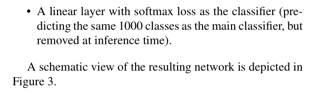 • linear layer 를 사용한 softmax loss as the classifier 1000(predicting the same 1000 classes as the main classifier, but removed at inference time).