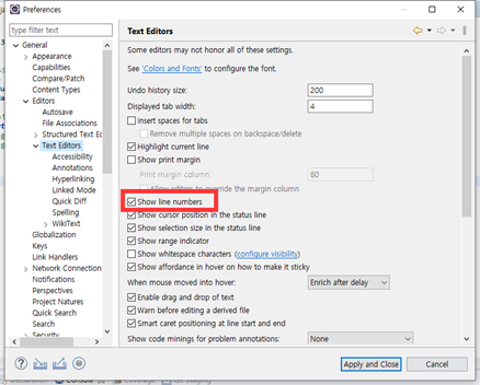 [Window -> Preferences] 를 클릭하고 트리 메뉴에서 [General -> Editors -> Text Edtors] =>show line numbers