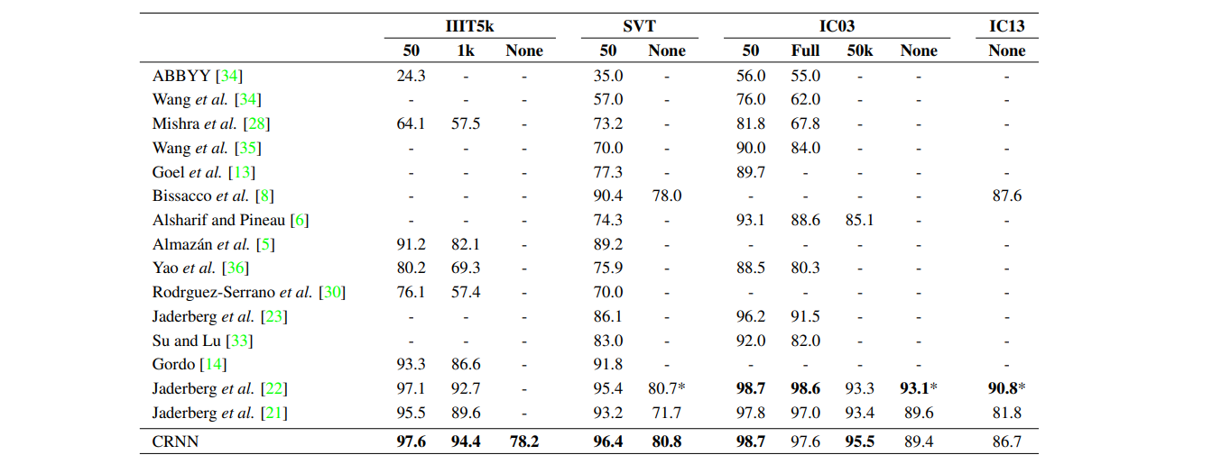 scene text recognition benchmarks 데이터 세트에 대한 실험은 CNN 및 RNN을 기반으로하는 기존 방법 및 기타 알고리즘과 비교할 때 CRNN이 우수하거나 매우 경쟁력있는 성능을 달성한다는 것을 보여줍니다. 이것은 제안 된 알고리즘의 장점을 확인합니다. 또한 CRNN은 CRNN의 일반화를 검증하는 OMR (Optical Music Recognition) 벤치 마크 데이터 세트에서 다른 경쟁사보다 훨씬 우수합니다.