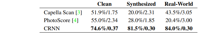 결과는 CRNN의 일반화를 보여줍니다. 다른 이미지 기반 시퀀스 인식 문제에 쉽게 적용 할 수 있고 도메인 지식이 거의 필요하지 않기 때문입니다. Capella Scan 및 PhotoScore와 비교할 때 CRNN 기반 시스템은 여전히 preliminary단계이며 많은 기능이 없습니다. 그러나 OMR에 대한 새로운 솔루션을 제공하고 pitch recognition에서 유망한 기능을 보여주었습니다.