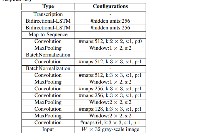 실험에서 사용한 네트워크 구성은 Table 1.에 요약되어 있습니다. convolutional layers의 아키텍처는 VGG-VeryDeep [32]의 아키텍처를 기반으로합니다. recognizing English texts에 적합하도록 조정되었습니다. 3rd and the 4th maxpooling layers 에서는 기존의 squared 대신 t 1 × 2 sized rectangular pooling windows을 사용합니다. 이 조정은 더 넓은 피쳐 맵을 생성하므로 더 긴 피쳐 시퀀스가 생성됩니다. 예를 들어, 10 개의 문자가 포함 된 이미지는 일반적으로 크기가 100x32이고 여기에서 25 프레임의 특징 시퀀스를 생성 할 수 있습니다. 이 길이는 대부분의 영어 단어의 길이를 초과합니다. 가장 중요한 것은 직사각형 풀 창에서 직사각형 수용 필드 (그림 2 참조)를 생성하여 i 및 l과 같은 좁은 모양의 문자를 인식하는 데 도움이됩니다.