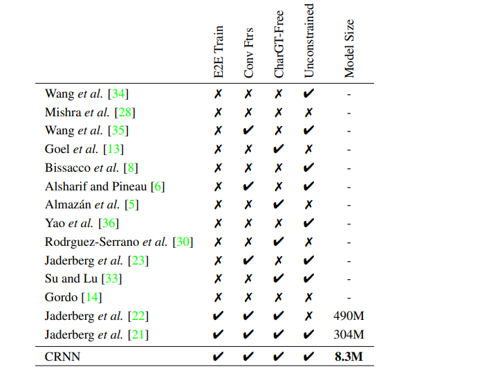 E2E Train: This column is to show whether a certain text reading model is end-to-end trainable, without any preprocess or through several separated steps, which indicates such approaches are elegant and clean for training. As can be observed from Table 3, only the models based on deep neural networks including [22, 21] as well as CRNN have this property.