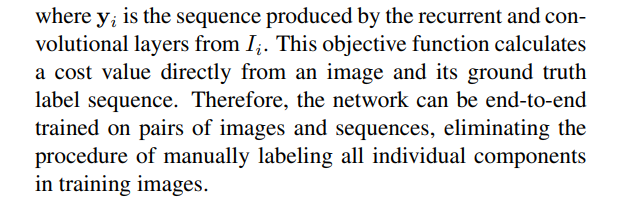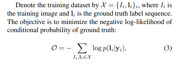 우리는 Graves 등이 제안한 CTC (Connectionist Temporal Classification) 계층에 정의 된 조건부 확률을 사용합니다 [15].label l 의 각 프레임의 예측 확률은 y = y 1, ..., Y t로 기록되며 특정 위치를 고려하지 않습니다. 따라서이 확률의 negative log-likelihood 을 네트워크 훈련의 대상으로 사용할 때 이미지와 해당 레이블 시퀀스 만 필요하므로 단일 문자의 위치를 표시하는 작업을 피할 수 있습니다.