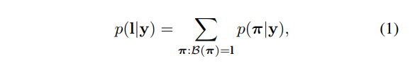 의 확률 분포이며 , 그중에서 L는ㄴ task중의 전부 lables를 포함하고 있다. (예: english characters) ,예를 들면 "blank"라벨로 표시한다. sequence-to-sequence mapping function B is defined on sequence