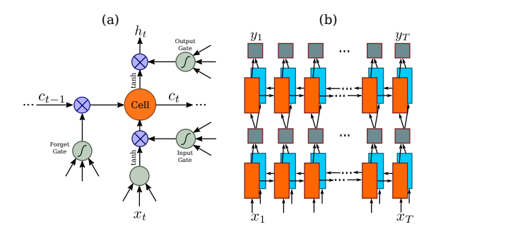 LSTM은 방향성이 있으며 과거 컨텍스트 만 사용합니다. 그러나 이미지 기반 시퀀스에서는 양방향의 컨텍스트가 유용하고 서로 보완 적입니다. 따라서 우리는 [17]에 따라 두 개의 LSTM (하나는 앞뒤로)을 bidirectional LSTM으로 결합합니다. 또한 여러 bidirectional LSTM을 스택하여 그림 3.b에 표시된 것처럼 deep bidirectional LSTM을 생성 할 수 있습니다. deep structure는 shallow 구조보다 더 높은 수준의 추상화를 허용하며 음성 인식 작업에서 상당한 성능 향상을 달성했습니다 [17].