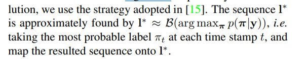 이 모드에서는 Eq. 1에 정의 된 확률이 가장 높은 시퀀스가 예측으로 사용됩니다. 정확한 해를 찾을 수있는 방법이 없기 때문에 [15]의 전략을 채택합니다. 시퀀스는 근사치에 의해 발견됩니다. 즉, 각 타임 스탬프에서 확률이 가장 큰 레이블이 사용되고 결과 시퀀스가 매핑됩니다.