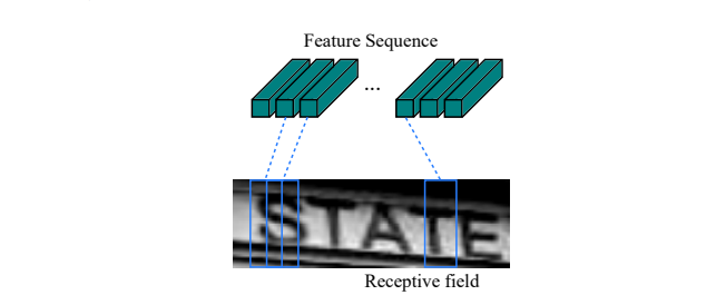 convolution, max-pooling, and elementwise activation function는 local regions에서 작동하므로 translation invariant입니다. 따라서 e feature maps의 각 열은 원본 이미지의 직사각형 영역 (termed the receptive field)에 해당하며, 이러한 직사각형 영역은 왼쪽에서 오른쪽으로 특징 맵의 해당 열과 동일한 순서입니다. 그림 2에서 볼 수 있듯이 특징 시퀀스의 각 벡터는 수용 필드와 연관되어 있으며 영역의 이미지 설명 자로 간주 될 수 있습니다.
