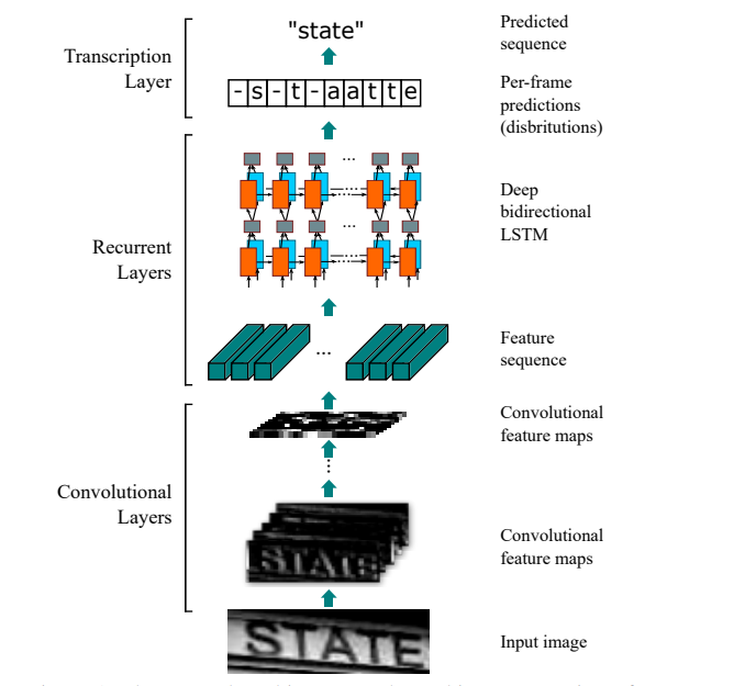 그림 1에서 볼 수 있듯이 CRNN의 네트워크 구조는 convolutional layer, recurrent layer, transcription layer의 세 부분으로 구성되어 있습니다.
