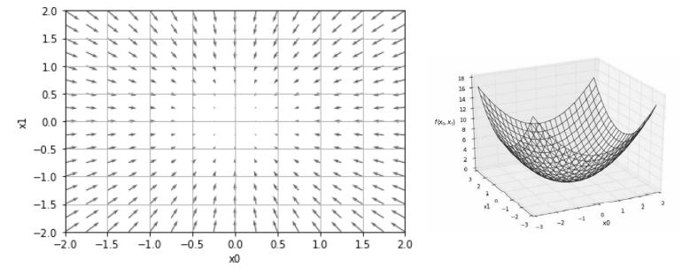 기울기가 가리키는 쪽은 각 장소에서 함수의 출력 값을 가장 크게 줄이는 방향입니다.
