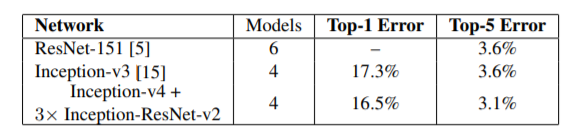 Table.5는 ensemble 결과를 비교한다. For the pure residual network the 6 models dense evaluation result is reported from [5]. For the inception networks 4 models were ensembled using the 144 crops strategy as described in [14].