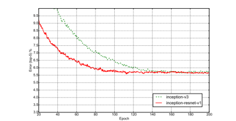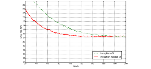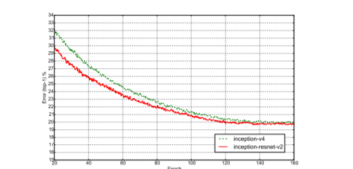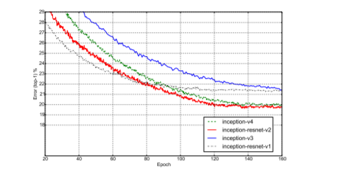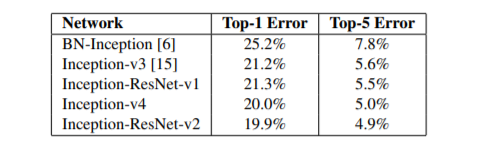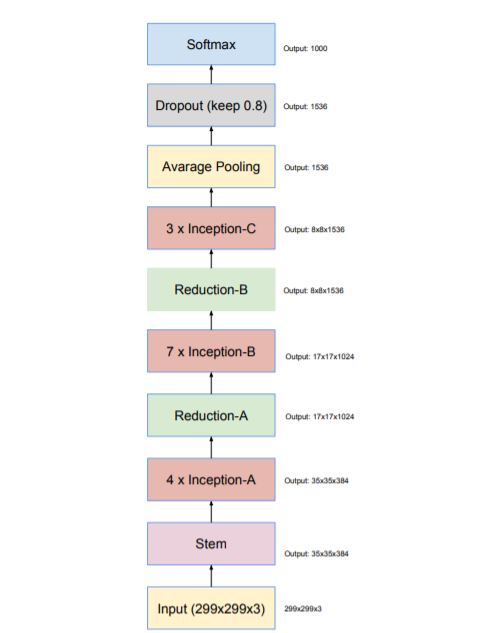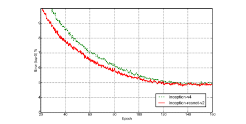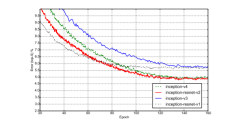 • Inception-v4: a pure Inception variant without residual connections with roughly the same recognition performance as Inception-ResNet-v2.