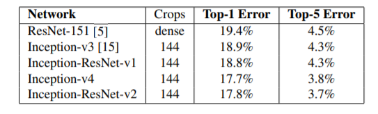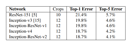 Table.3은 다양한 모델들이 적은 수의 crop을 사용한 경우의 성능을 보여준다. 10 crops for ResNet as was reported in [5]), for the Inception variants, we have used the 12 crops evaluation as as described in [14].10/12-crop evaluation, single model에 대한 실험 결과이다.