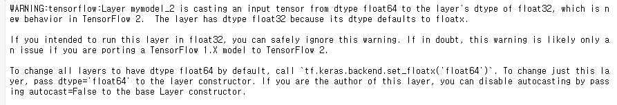 tensorflow:Layer mymodel_2 is casting an input tensor from dtype float64 to the layer's dtype of float32, which is new behavior in TensorFlow 2. The layer has dtype float32 because its dtype defaults to floatx. If you intended to run this layer in float32, you can safely ignore this warning. If in doubt, this warning is likely only an issue if you are porting a TensorFlow 1.X model to TensorFlow 2. To change all layers to have dtype float64 by default, call `tf.keras.backend.set_floatx('float64')`. To change just this layer, pass dtype='float64' to the layer constructor. If you are the author of this layer, you can disable autocasting by passing autocast=False to the base Layer constructor.