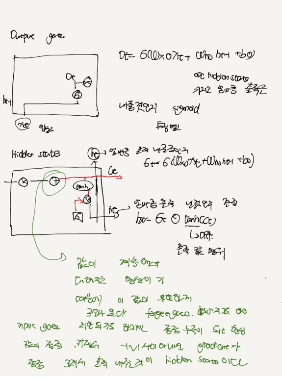 hidden state: 이전 reset gate,forget gate를 모두 적용하여 hidden state를 계산한다.
