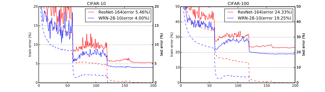 또한 CIFAR-10에서 wide WRN-28-10의 성능은 thin ResNet-1001보다 0.92 % 더 우수하고 (훈련 중 동일한 미니 배치 크기로) CIFAR-100에서는 wide WRN-28-10이 thin ResNet-1001보다 우수합니다. ResNet-1001은 3.46 % 더 높고 레이어 수가 36 배 적습니다 (표 5 참조). ResNet-1001의 결과는 4.64 %이고 배치 크기는 64 인 반면 모든 실험에서 사용한 배치 크기는 128입니다 (즉, 표 5에보고 된 다른 모든 결과의 배치 크기는 128 임). . 이러한 네트워크의 훈련 곡선은 그림 2에 나와 있습니다.