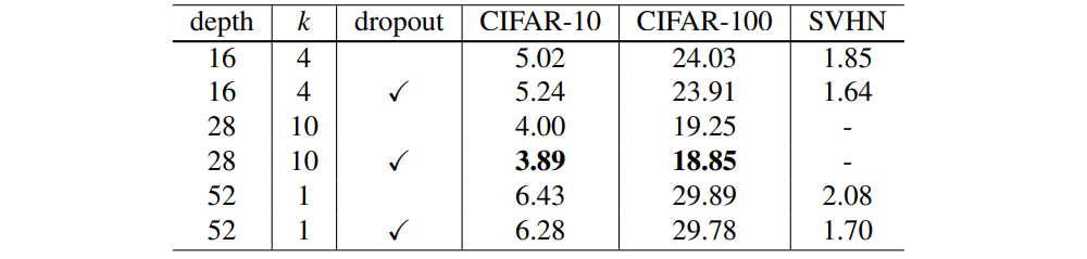 위의 결과를 바탕으로 비슷한 수의 매개 변수를 가진 블록에 대해 얻은 결과는 거의 동일합니다. 이 사실로 인해 다른 방법과 일관성을 유지하기 위해 3x3 컨볼 루션 만있는 WRN에 대한주의를 제한합니다.