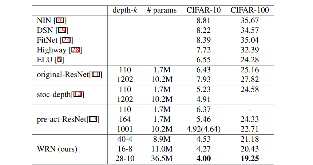 다른 결과는 표 5에 나와 있습니다. 표 5에서는 thin resisdual 네트워크와 wide resisdual 네트워크를 비교합니다. wide WRN-40-4는 CIFAR-10과 CIFAR-100 모두에서 더 나은 정확도를 가지고 있기 때문에 thin ResNet-1001보다 낫다는 것을 알 수 있습니다. 그러나 이러한 네트워크에 8.9x10^6 및 10.2x10^6이라는 비슷한 수의 매개 변수가 있다는 것이 흥미 롭습니다. 이는이 수준에서 깊이가 너비에 비해 정규화 효과를 증가시키지 않음을 보여줍니다. 벤치 마크 포인트에서 더 살펴 보았 듯이 WRN-40-4의 훈련 속도는 원본의 8 배이므로 원본 씬 잔여 네트워크의 종횡비가 최적과는 거리가 멀다는 것이 분명합니다.