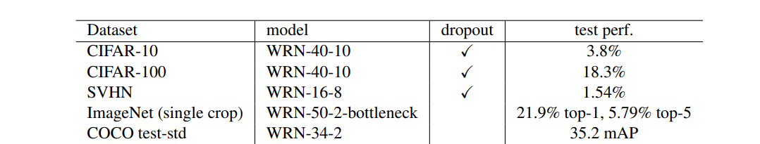 마지막으로 표 9에는 일반적으로 사용되는 다양한 데이터 세트에 대한 최상의 WRN 결과가 요약되어 있습니다.