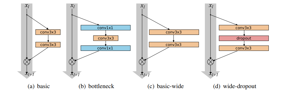 [13]의 원래 아키텍처 [11]와 비교하여 나머지 블록의 배치 정규화, 활성화 및 컨볼 루션 순서는 conv BN ReLU에서 BN-ReLU-conv로 변경됩니다. 후자는 더 빠른 훈련 속도와 더 나은 결과를 가지고 있기 때문에 우리는 원래 버전을 고려하지 않습니다. 또한, 소위 «bottleneck»블록은 원래 블록의 계산 비용을 줄여 레이어 수를 늘리는 데 사용되었습니다. 확장의 효과와 네트워크를 더 얇게 만드는 데 사용되는 «bottleneck»을 연구하고자하므로 고려하지 않고 «basic» residual 구조에 초점을 맞 춥니다.