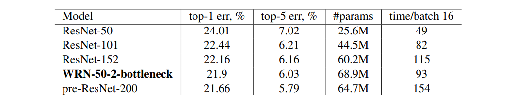 ImageNet의 경우 먼저 병목 현상이없는 ResNet-18 및 ResNet-34로 실험하고 폭을 1.0에서 3.0으로 점진적으로 늘리려 고합니다. 결과를 표 7에 나타냈다. 너비를 늘리면 두 네트워크의 정확도가 점차적으로 증가하고 비슷한 수의 매개 변수를 가진 네트워크는 깊이가 다르더라도 유사한 결과를 얻을 수 있습니다. 이러한 네트워크에는 매개 변수가 많지만 병목 네트워크가 그들보다 낫습니다. 병목 구조가 ImageNet 분류 작업에 더 적합하거나이 복잡한 작업에 더 깊은 네트워크가 필요하기 때문일 수 있습니다. 이를 확인하기 위해 ResNet-50을 채택하고 내부 3x3 레이어의 너비를 늘려 더 넓게 만들려고했습니다. widening factor가 2.0이면 WRN-50-2-bottleneck의 성능이 ResNet-152보다 우수하고 계층 수가 3 배 감소하며 속도가 훨씬 빠릅니다. WRN-50-2- bottleneck은 매개 변수가 약간 더 많음에도 불구하고 성능이 가장 우수한 사전 활성화 된 ResNet-200보다 거의 2 배 더 빠릅니다 (표 8). 일반적으로 CIFAR와 달리 ImageNet 네트워크는 동일한 정확도를 달성하기 위해 동일한 깊이에서 더 큰 너비가 필요하다는 것을 발견했습니다. 그러나 계산상의 이유로 50 개 이상의 레이어가있는 잔여 네트워크를 사용할 필요가 없다는 것은 분명합니다.