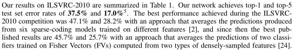 | ILSVRC-2012 competition | achieved a winning top-5 test error rate of 15.3%, compared to 26.2% achieved by the second-best entry. |