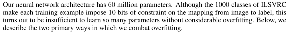 Section 4 : 네트워크 크기는 120만 개의 레이블링된 교육 예제로도 심각한 overfitting 문제를 일으켰기 때문에 overfitting 을 방지하기 위한 몇 가지 효과적인 기술을 사용했다.