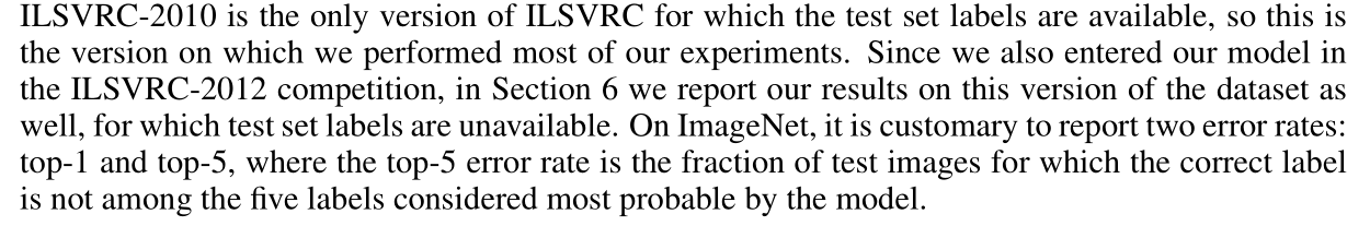 ILSVRC-2010은 test set labels를 사용할 수 있는 ILSVRC의 유일한 버전이기 때문에 대부분의 실험을 수행한 버전이다.
