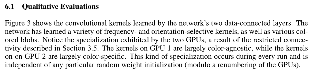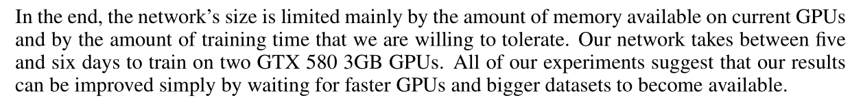 결국 network의 크기는 주로 현재 GPU에서 사용할 수 있는 메모리의 양과 우리가 허용하고자 하는 훈련 시간의 양에 의해 제한된다. 우리의 network는 두 개의 GTX 580 3GB GPU로 훈련하는 데 5~6일이 걸린다. 우리의 모든 실험은 GPU와 더 큰 데이터셋을 사용할 수 있기를 기다리는 것만으로도 결과를 개선할 수 있음을 제안한다.