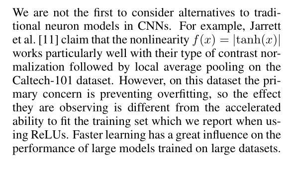 CNN에서 traditional neuron models의 대안을 고려하는 것은 우리가 처음이 아니다.예를 들어, Jarrett etal.[11] nonlinearity f(x) = |tanh(x)|가 Caltech-101 data set의 local average pooling에 이어 normalization 유형과 특히 잘 작동한다는 것을 입증한다.하지마 , 이 dataset의 주요 관심사는 overfitting을 방지하는 것이므로 이들이 관찰하는 효과는 ReLU를 사용할 때 보고하는 training set를 맞추는 가속화된 능력과는 다르다. 빠른 학습은 대규모 데이터 세트에서 훈련된 대규모 모델의 성능에 큰 영향을 미친다.