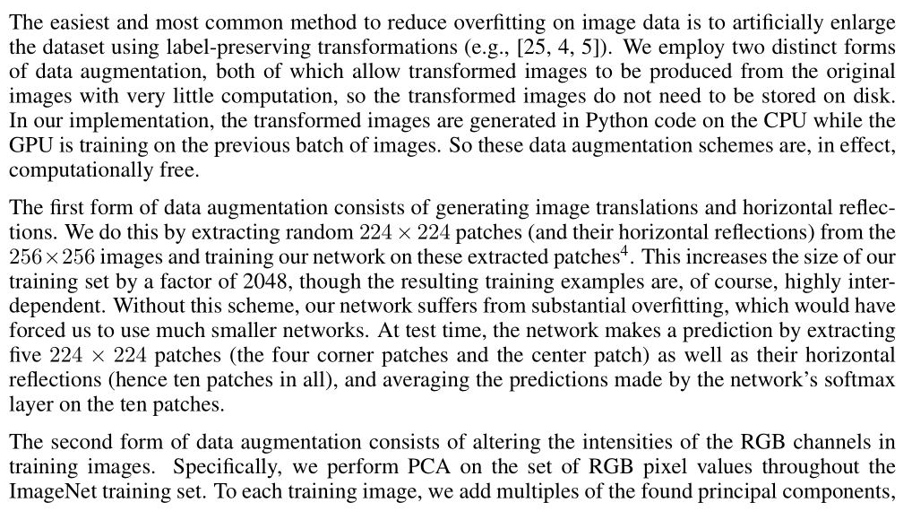 data augmentation의 첫번째 형태는 image translations와 horizontal reflections으로 구성된다. 우리는 256×256이미지에서 random 224×224 patches (and their horizontal reflections) 를 추출하고 추출된 patches 에 대해 네트워크를 훈련시킴으로써 이를 수행한다. 이는 2048배까지 훈련의 크기를 증가시킨다. 물론 결과적인 훈련 예는 상호의존성이 매우 높다. 이 계획이 없었드라면 , 우리의 network는 상당한 overfitting으로 어려움을 겪었고 , 이로 인해 우리는 훨씬 더 작은 네트워크를 사용해야만 했을 것이다. test를 할 경우에 , 네트워크는 5개의 patches (the four corner patches and the center patch )horizontal reflections (hence ten patches in all) 를 추출하고 10개의 패치에서 네트워크의 소프트맥스 계층에 의해 예측된 결과를 평균화하여 예측한다.