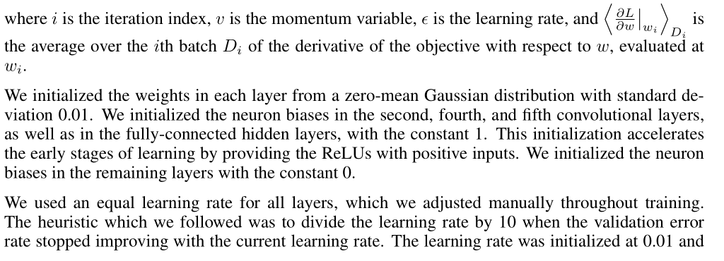 distribution에서 각 layer의 가 중치를 초기화했다. 우리는 neuron biases을 second, fourth, fifth convolutional layers와 fully-connected hidden layers에서 상수 1로 초기화했다. 이 초기화는 ReLU에 긍정적인 입력을 제공하여 학습의 초기 단계를 가속화한다. 우리는 나머지 층에서 뉴런 편향을 상수가 0으로 초기화했다.