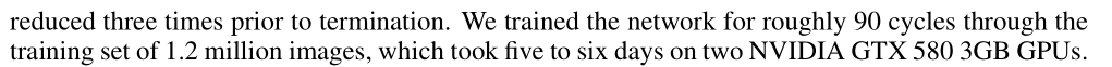 all layers에 동일한 learning rate를 사용하였고 training 동안에 수동으로 조정하였다. 우리가 따르는 heuristic 은 검증 오류율이 현재 학습 속도에 따라 더 이상 향상되지 않을 때 학습률을 10으로 나누는 것이었다. learning rate은 0.01로 초기화하되었으며 종료전에는 세 번 감소되었다. 우리는 120만 장의 이미지 training set 를 두 개의 NVIDIA GTX 580 3GB GPU에서 5일에서 6일이 걸린 통해 약 90 사이클 동안 네트워크를 학습했다.