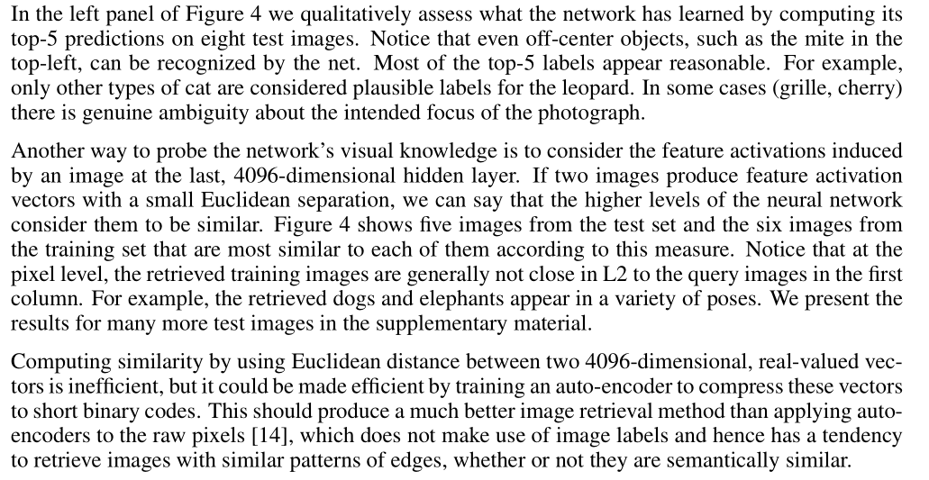 (오른쪽) 첫 번째 열에 있는 ILSVRC-2010 테스트 이미지 5개이다. 나머지 열은 테스트 이미지의 형상 벡터로부터 가장 작은 유클리드 거리를 가진 마지막 hidden layer에서 feature vectors 를 생성하는 6개의 훈련 이미지를 보여준다. 두개의 4096-dimensional에서 real-valued 벡터 사이의 Euclidean distance를 사용하여 유사성을 계산하는 것은 비효율적이지만, 이러한 벡터를 짧은 이진 코드로 압축하도록 auto-encoder를 훈련시키면 효율적으로 만들 수 있다. 이렇게 하면 이미지 레이블을 사용하지 않는 raw pixels [14]에 auto-encoders을 적용하는 것보다 훨씬 더 나은 이미지 검색 방법이 생성되어야 하며, 따라서 의미적으로 유사하든 아니든 유사한 가장자리 패턴을 가진 이미지를 검색하는 경향이 있다.
