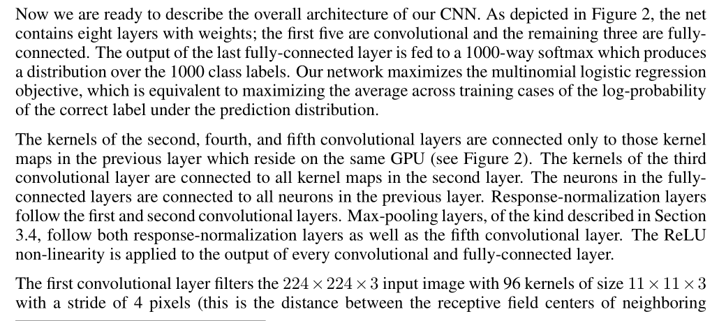 이제 우리는 CNN의 전반적인 architecture에 대해서 소계할 준비가 되였다. Figure 2에서 묘사한 것처럼 net 에는 가중치가 있는 8개의 layers 이 포함되어 있다. 마지막 fully-connected layer의 출력은 1000 class labels 에 대한 distribution 를 생성하는 1000-way softmax에 공급된다. 우리의 네트워크는 multinomial logistic regression objective를 최적화하는데 , 이는 예측 분포에서