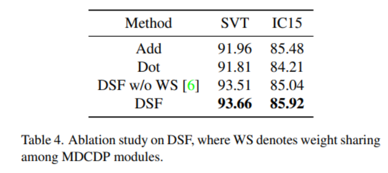 DSF outperforms static-based fusions (Add and Dot) as well as the scheme that not sharing weights among MDCDP modules.