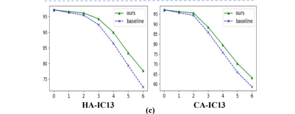 (c) We develop CDistNet that perceives multi-domain character distance better by position-related joint encoding. Compared with baseline, the accuracy margin becomes larger as the deformation severity rises.