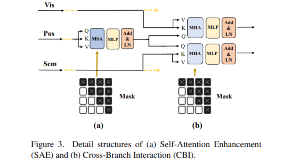 하지만 , 우리는 semantic branch는 그대로 둔다. 대조적으로, we formulate the interactions as the positional-based intermediate enhancement to both visual and semantic domains. It reinforces not only visual but also semantic features and can be understood as delineating the multi-domain character distance.